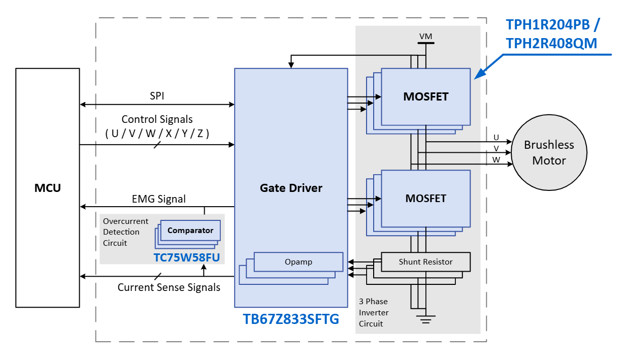 三相无刷直流电机驱动电路结合了六个MOSFET(TPH1R204PB、TPH2R408QM)和一个栅极驱动器(TB67Z833SFTG),实现了紧凑而高效的电机控制。它支持各种输入模式。该参考设计提供设计指南、数据和其他内容。